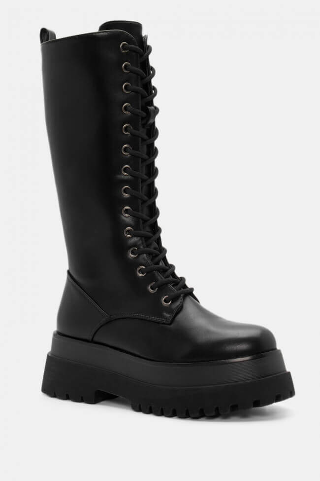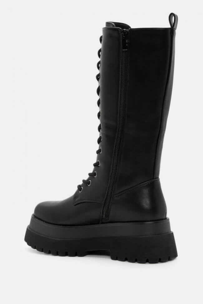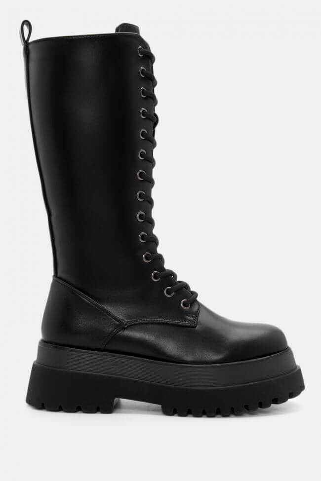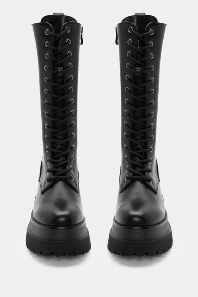 - Βάλε μια ψηλή μπότα-κάλτα με κορδόνια και τρακτερωτή σόλα μπεζ και mini ή midi φορέματα για ένα look που ισορροπεί τη θηλυκότητα με τον δυναμισμό.