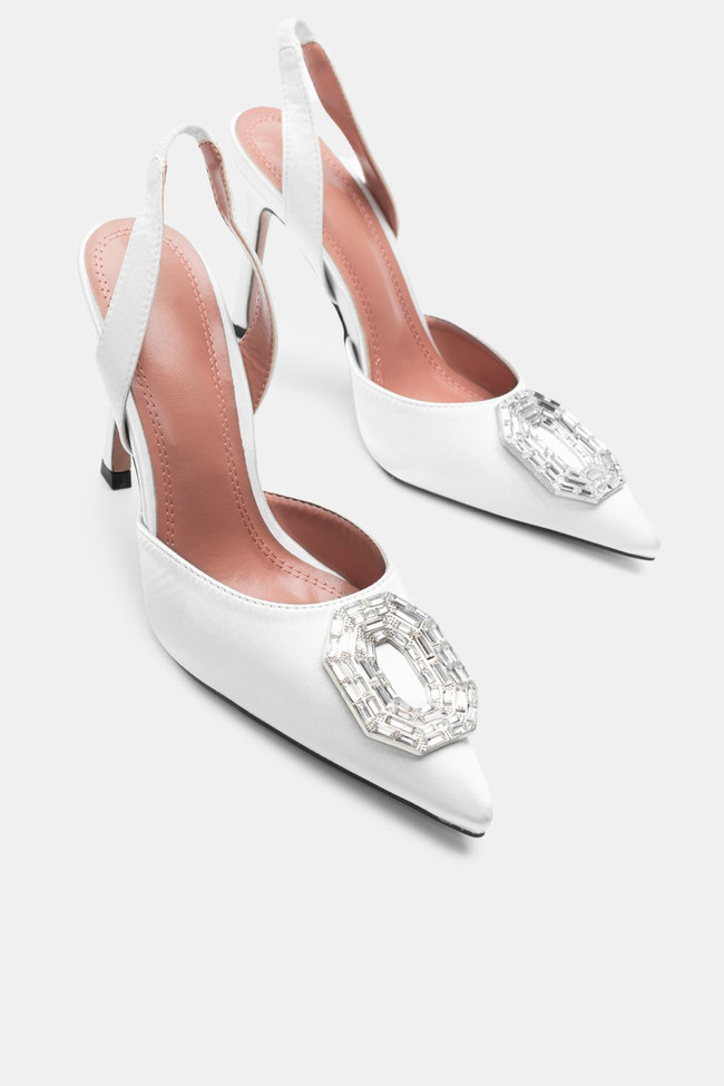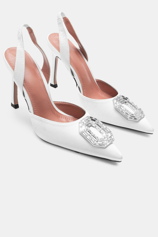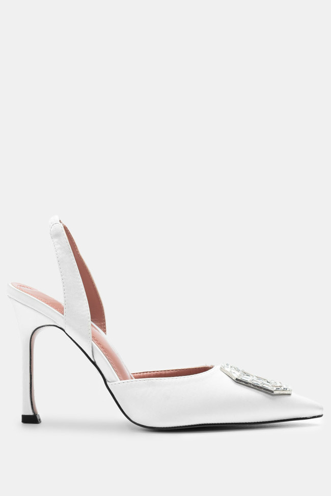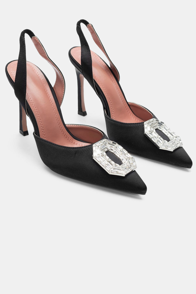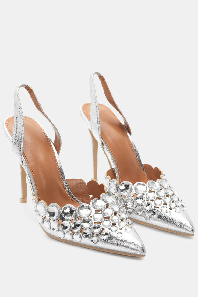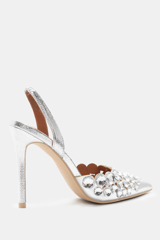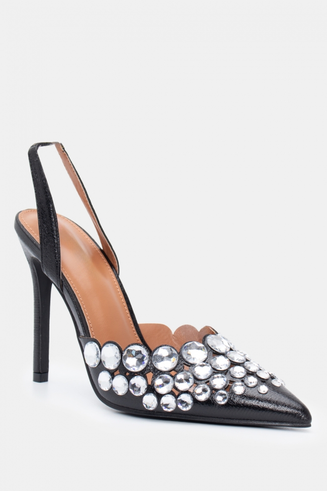 Остри обувки на висок ток с отворена пета, прозрачни елементи и страсс