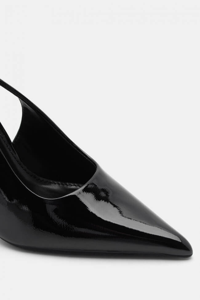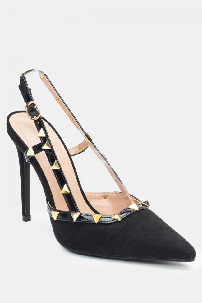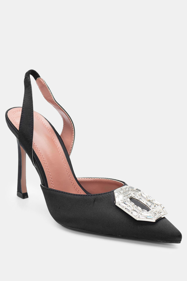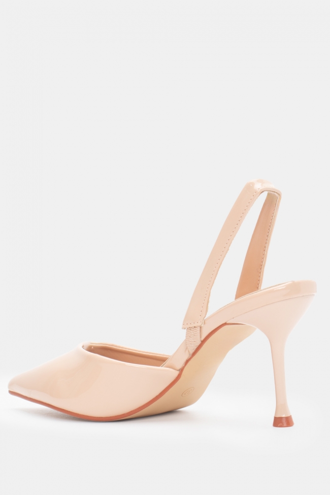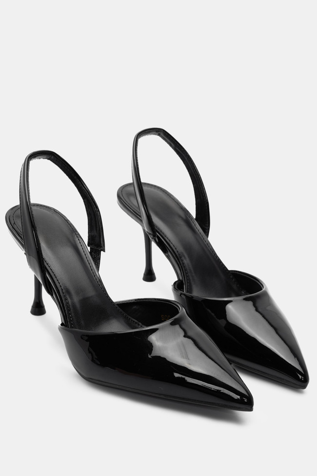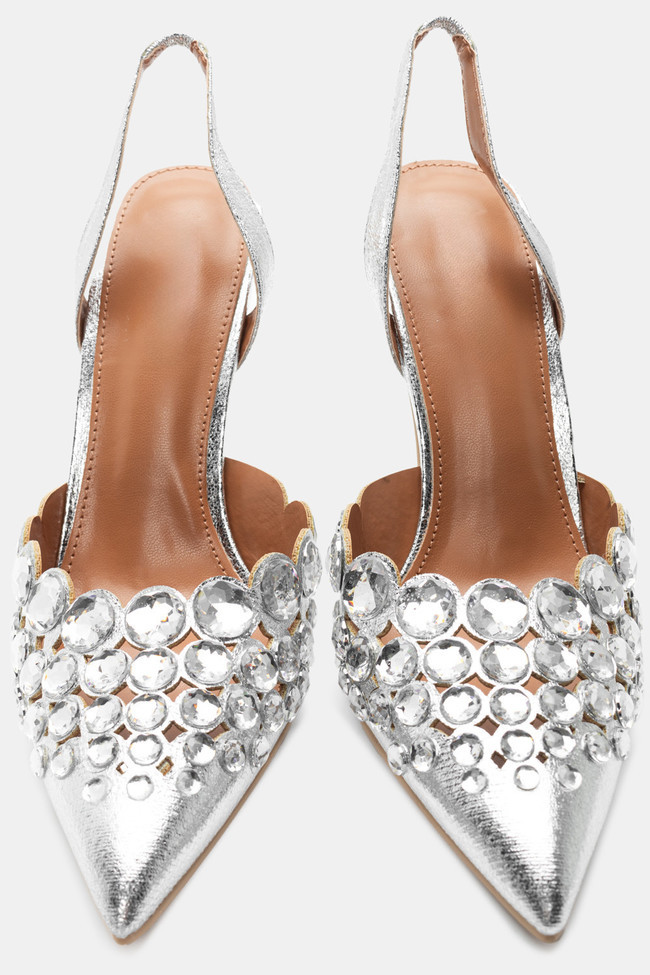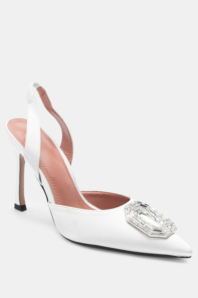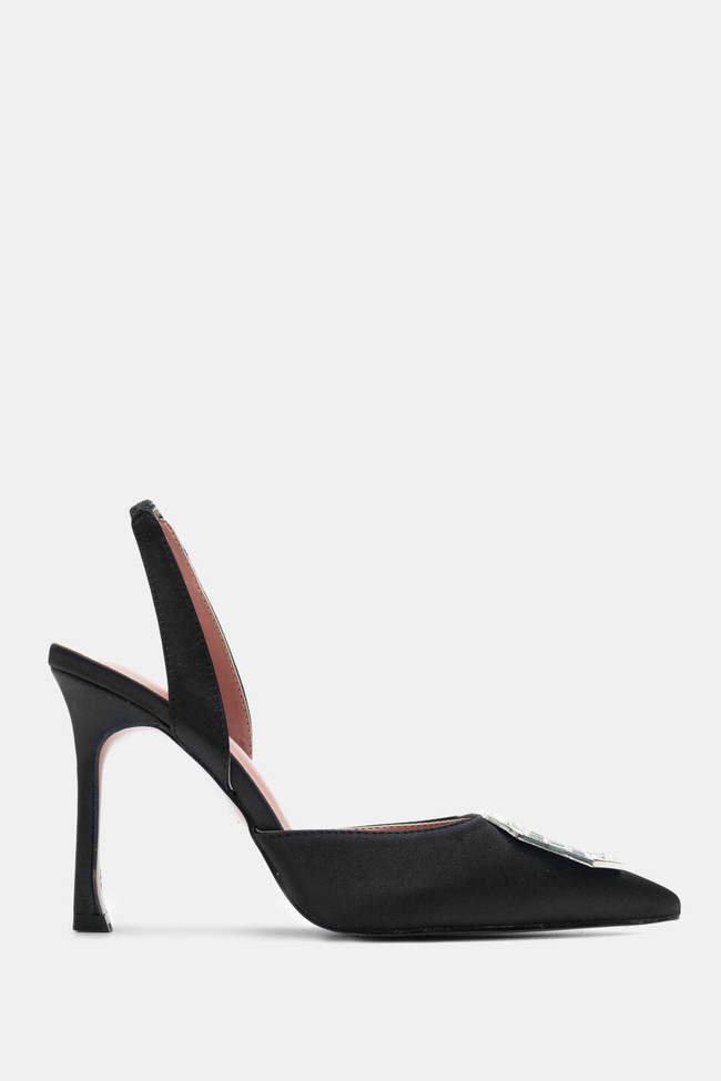 Остри обувки на висок ток с отворена пета, прозрачни елементи и страсс