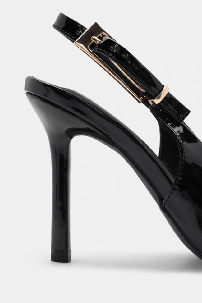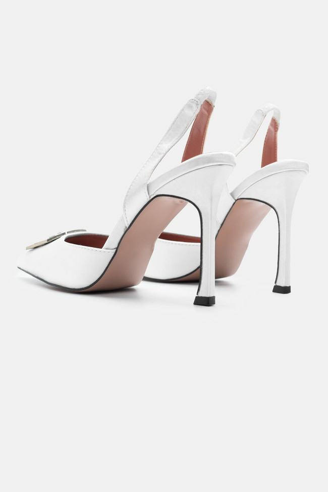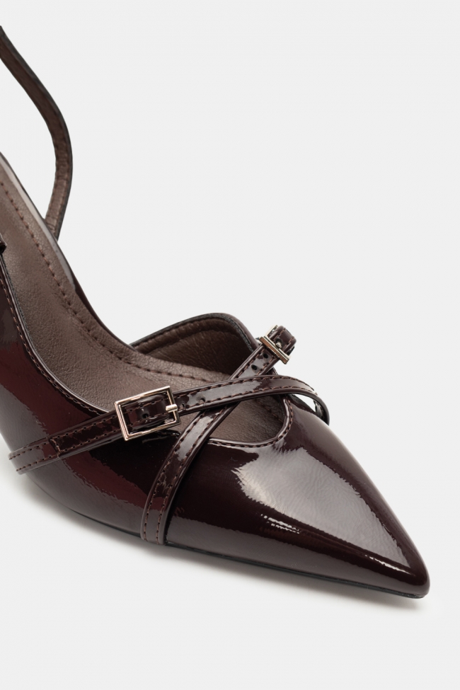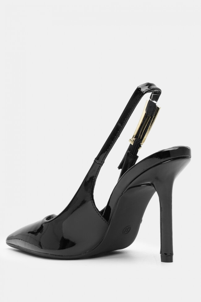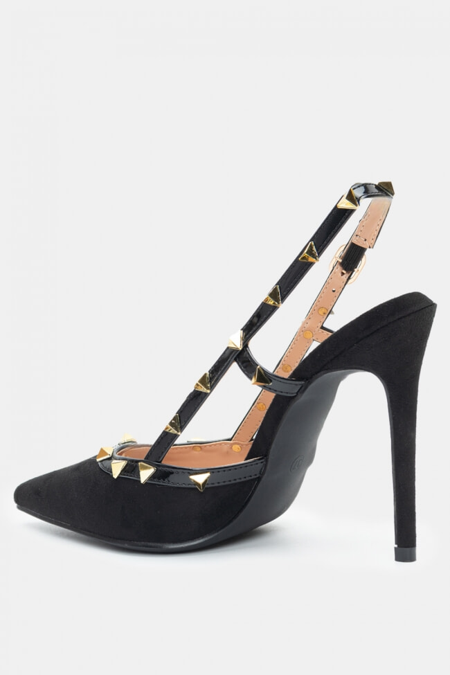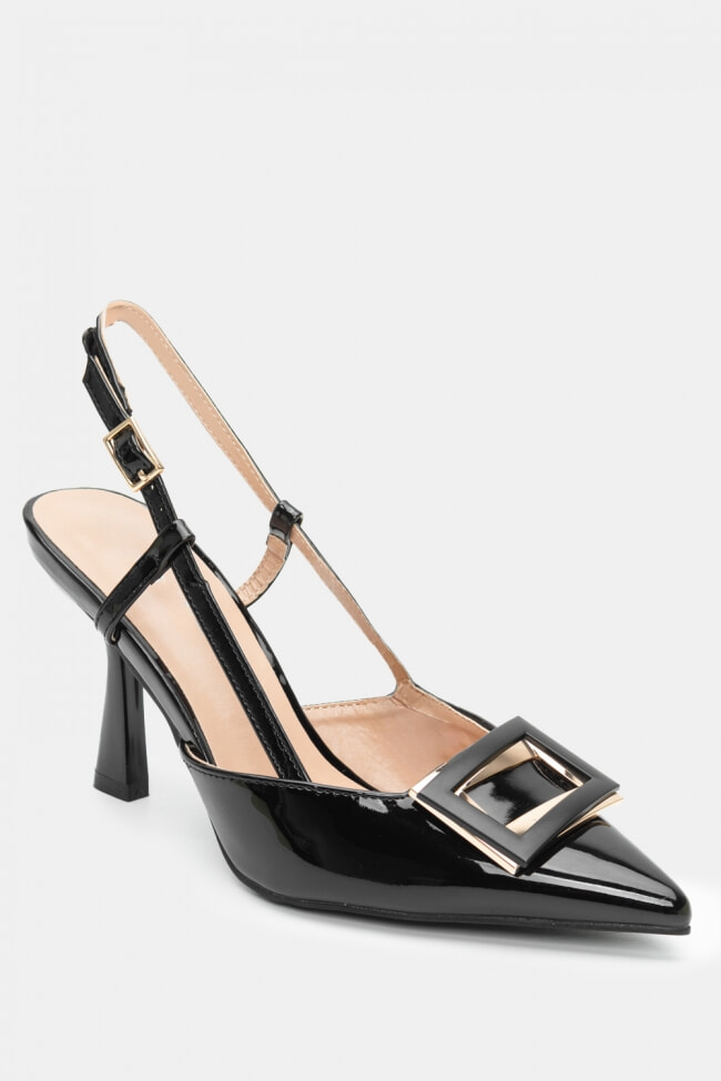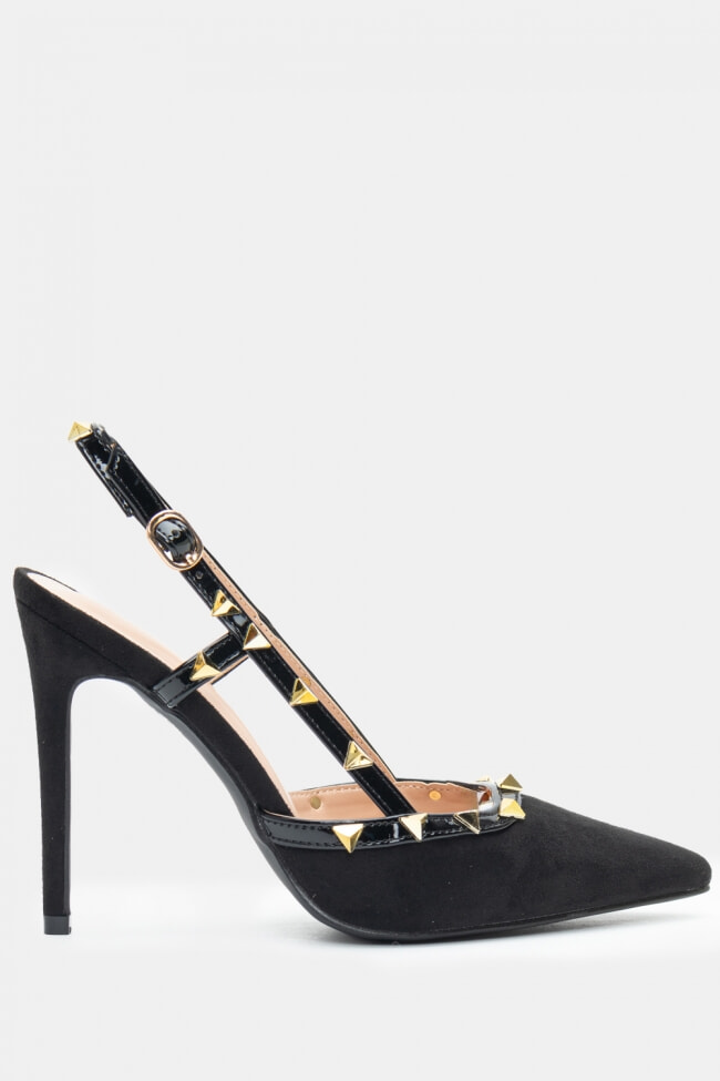 Остри обувки на висок ток с отворена пета, прозрачни елементи и страсс