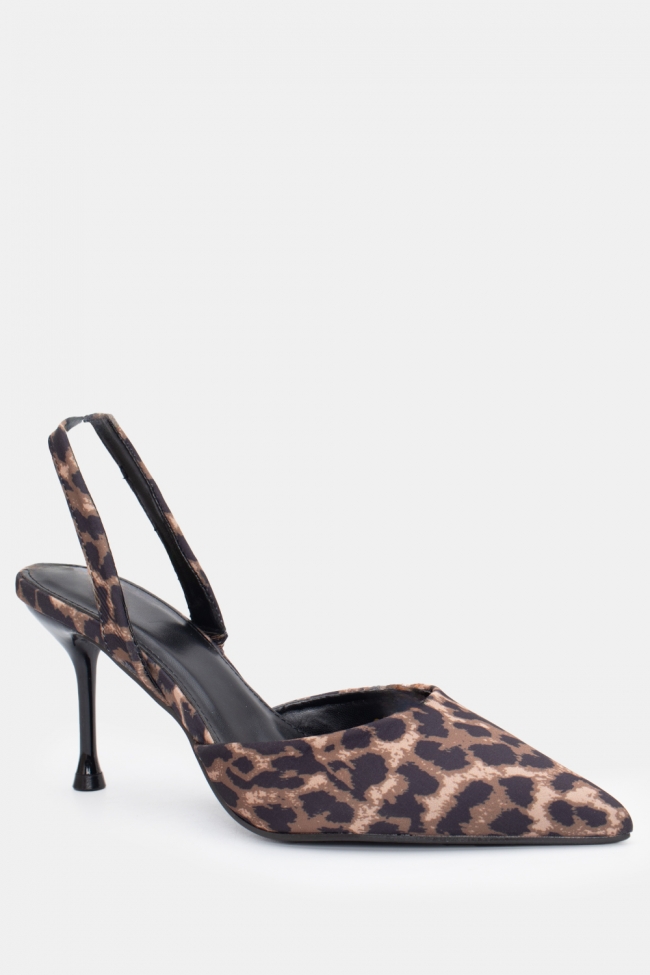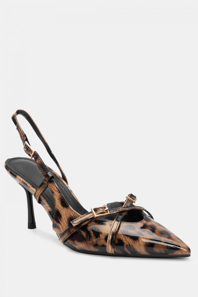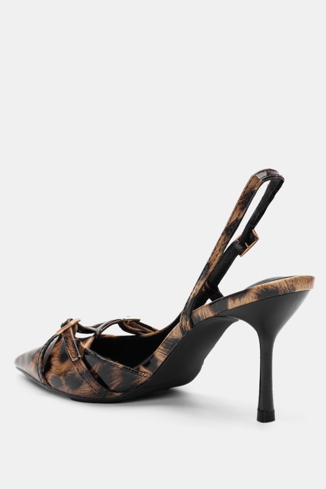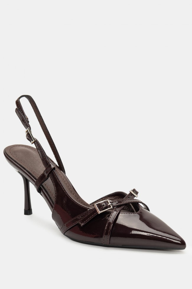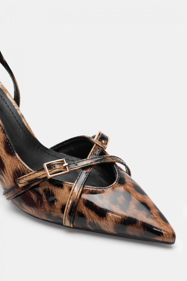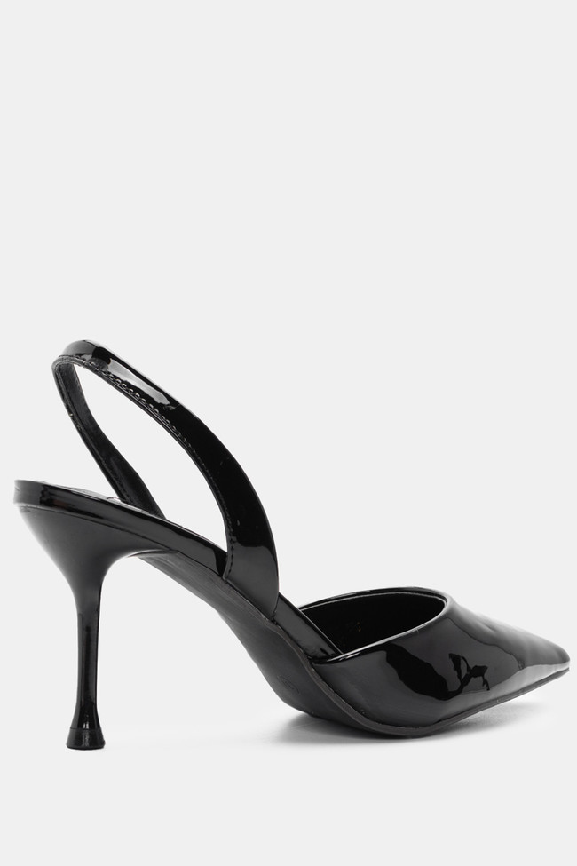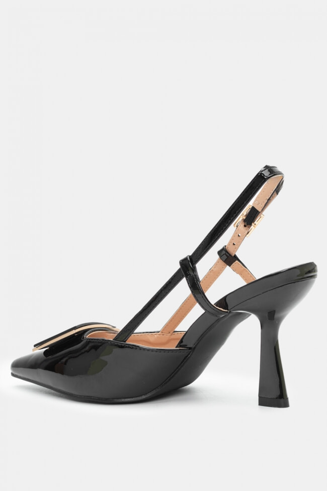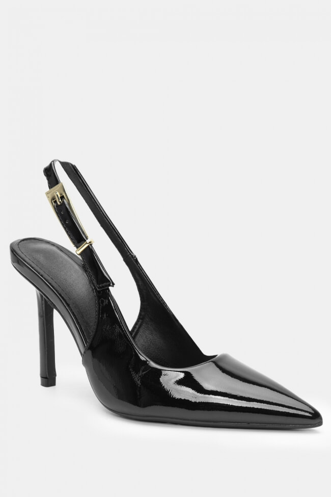 Остри обувки на висок ток с отворена пета, прозрачни елементи и страсс